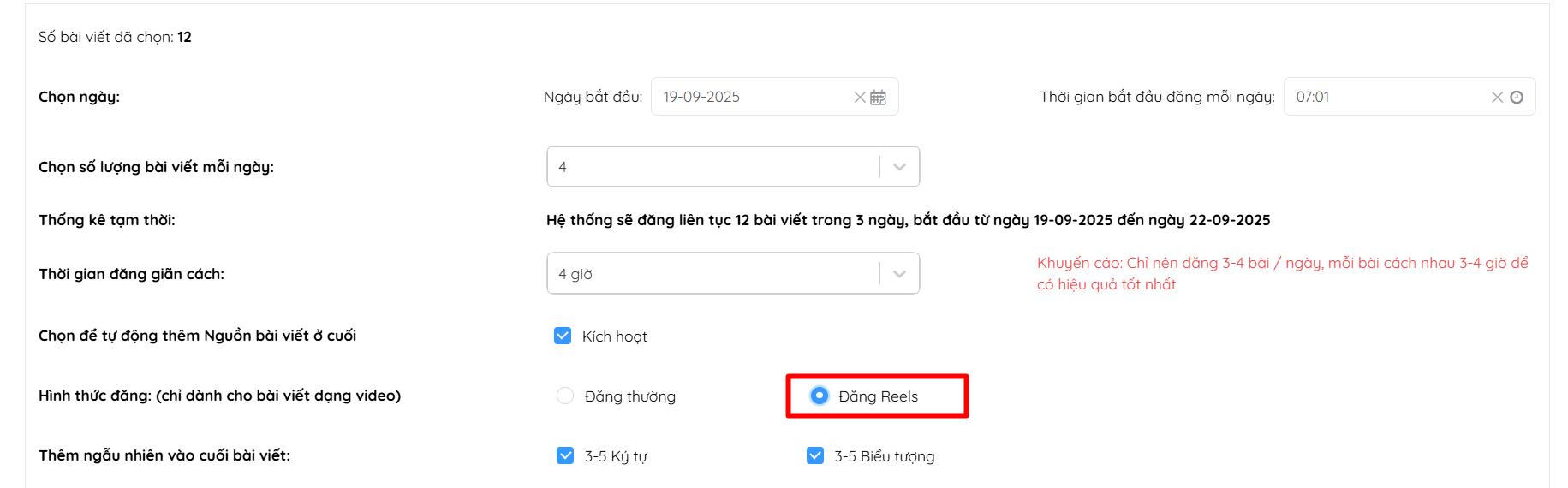 Setup ngày tháng: Bắt đầu đăng vào ngày nào, vào lúc mấy giờ, mỗi ngày chỉ cần đăng 3-5 video, mỗi video cách nhau 3-5 giờ là được không cần nhiều. Nhớ TICK CHỌN CHẾ ĐỘ ĐĂNG REELS nếu bạn muốn reup các video short <90s từ Youtube nhé: