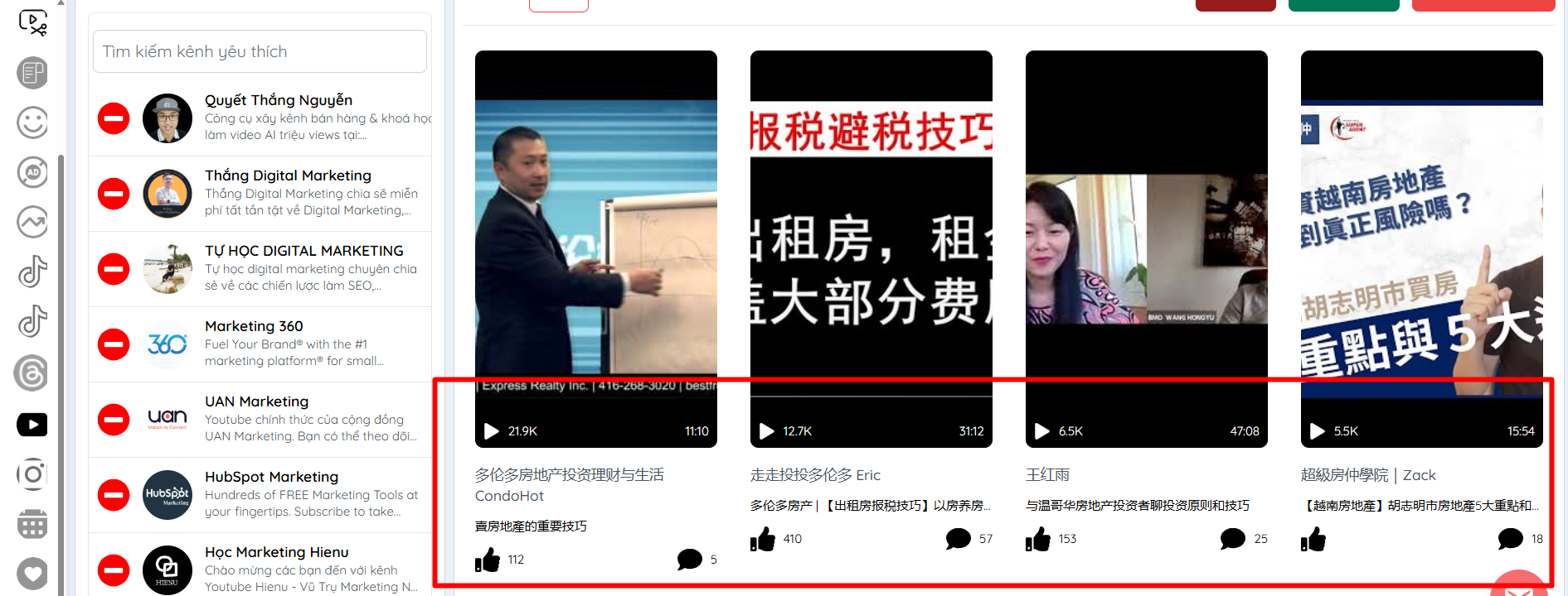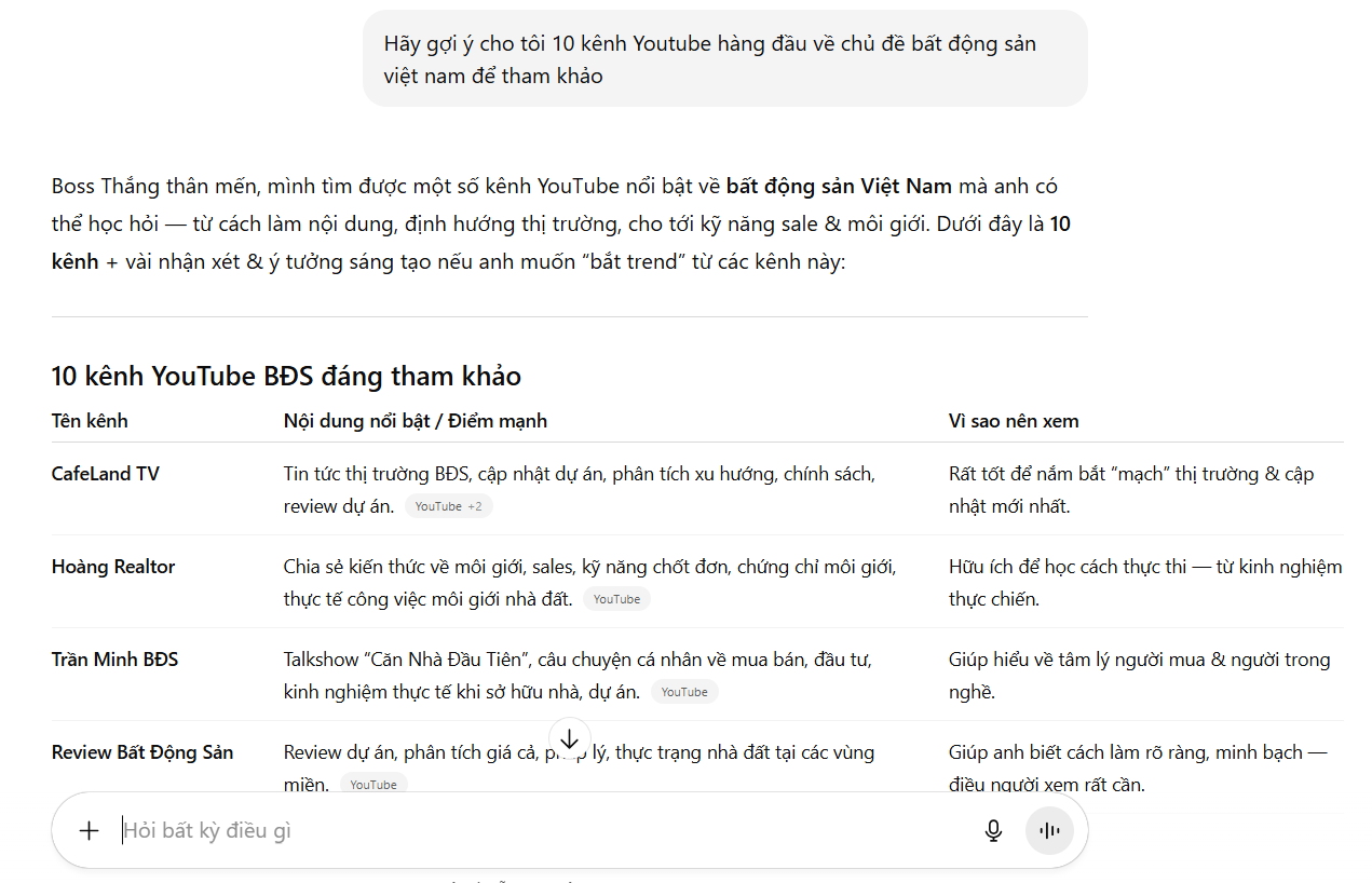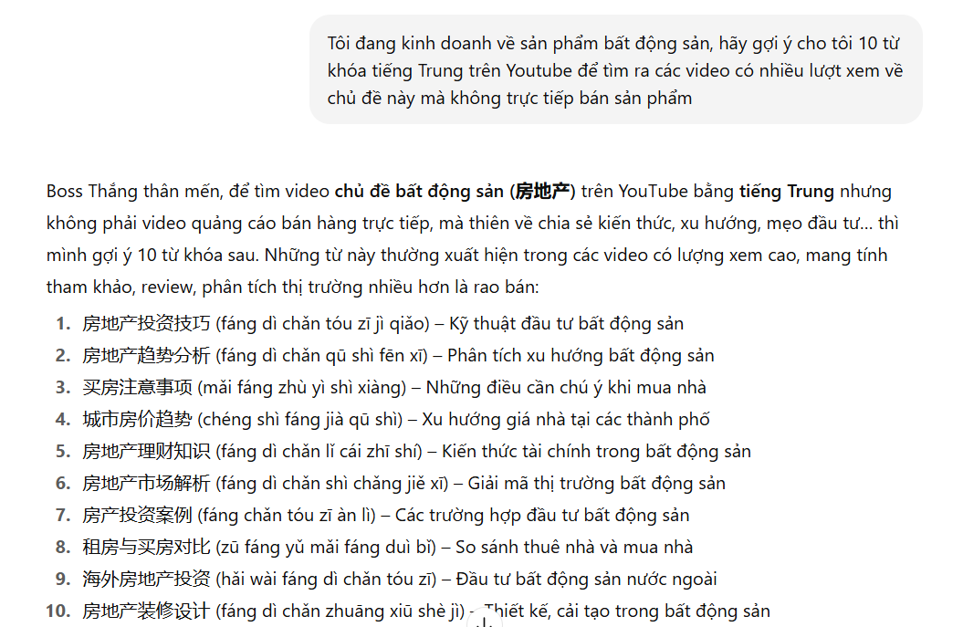 – Thử dụng ChatGPT để tìm từ khóa nhé: “Tôi đang kinh doanh về sản phẩm X (bất động sản), hãy gợi ý cho tôi 10 từ khóa tiếng Trung trên Youtube để tìm ra các video có nhiều lượt xem về chủ đề này mà không trực tiếp bán sản phẩm”