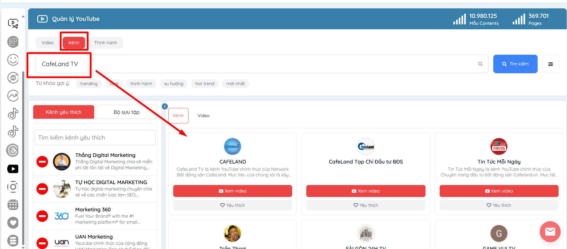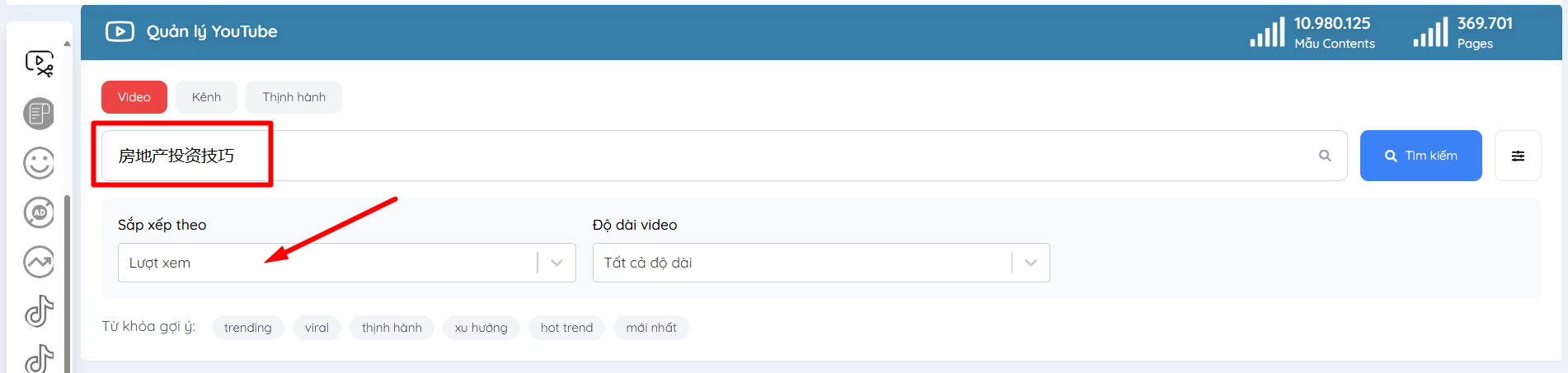 Giờ chỉ cần vào Kingcontent.pro, chọn menu QUẢN LÝ YOUTUBE, dán các từ khóa để tìm: