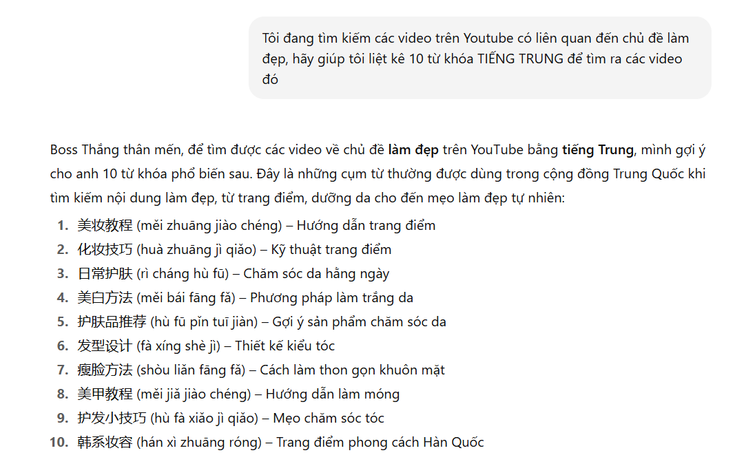 – Mẹo: sử dụng ChatGPT để tìm ra các video đúng đối tượng trên Youtube, hãy tham khảo câu lệnh sau: “Tôi đang tìm kiếm các video trên Youtube có liên quan đến chủ đề X (ví dụ làm đẹp, tình yêu, mẹo cuộc sống…), hãy giúp tôi liệt kê 10 từ khóa TIẾNG TRUNG để tìm ra các video đó”. Bạn có thể tìm các từ khóa tiếng Anh, nhiều thứ tiếng khác nữa, nhưng đừng bao giờ bỏ qua từ khóa tiếng Trung nhé, vì nội dung rất phù hợp với đối tượng khán giả Việt Nam: