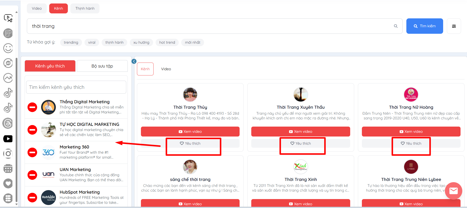 NHẤN VÀO NÚT “YÊU THÍCH” để đưa nó vào theo dõi đặc biệt, danh sách các kênh này sẽ nằm sẵn ở bên trái. Sau này vào dùng bạn không cần phải tìm lại nữa: