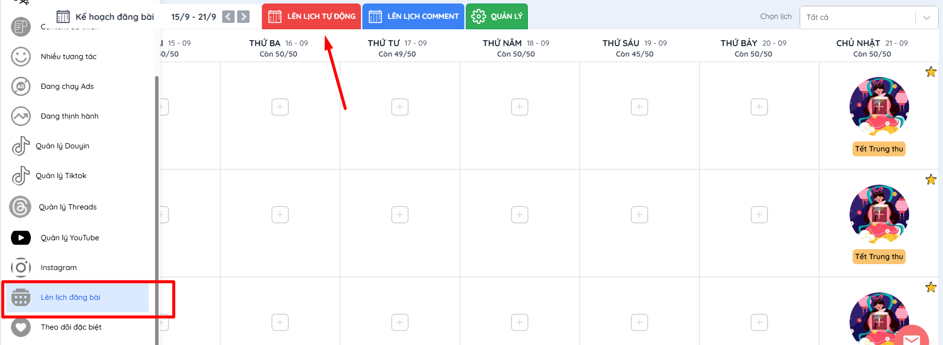 Tại Kingcontent.pro, vào menu LÊN LỊCH ĐĂNG BÀI – LÊN LỊCH TỰ ĐỘNG