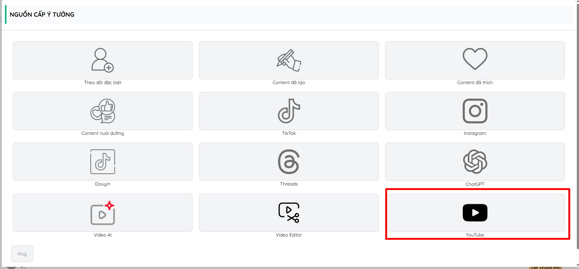 Chọn nguồn cấp nội dung là YOUTUBE: