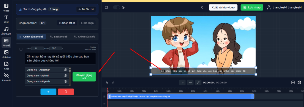 Sửa đoạn phụ đề lại theo ý bạn muốn, có thể thay mỗi đoạn khác nhau bằng một giọng đọc khác nhau luôn. Khi bạn gõ văn bản vào đây, AI sẽ tự đọc lại đoạn văn bản đó: