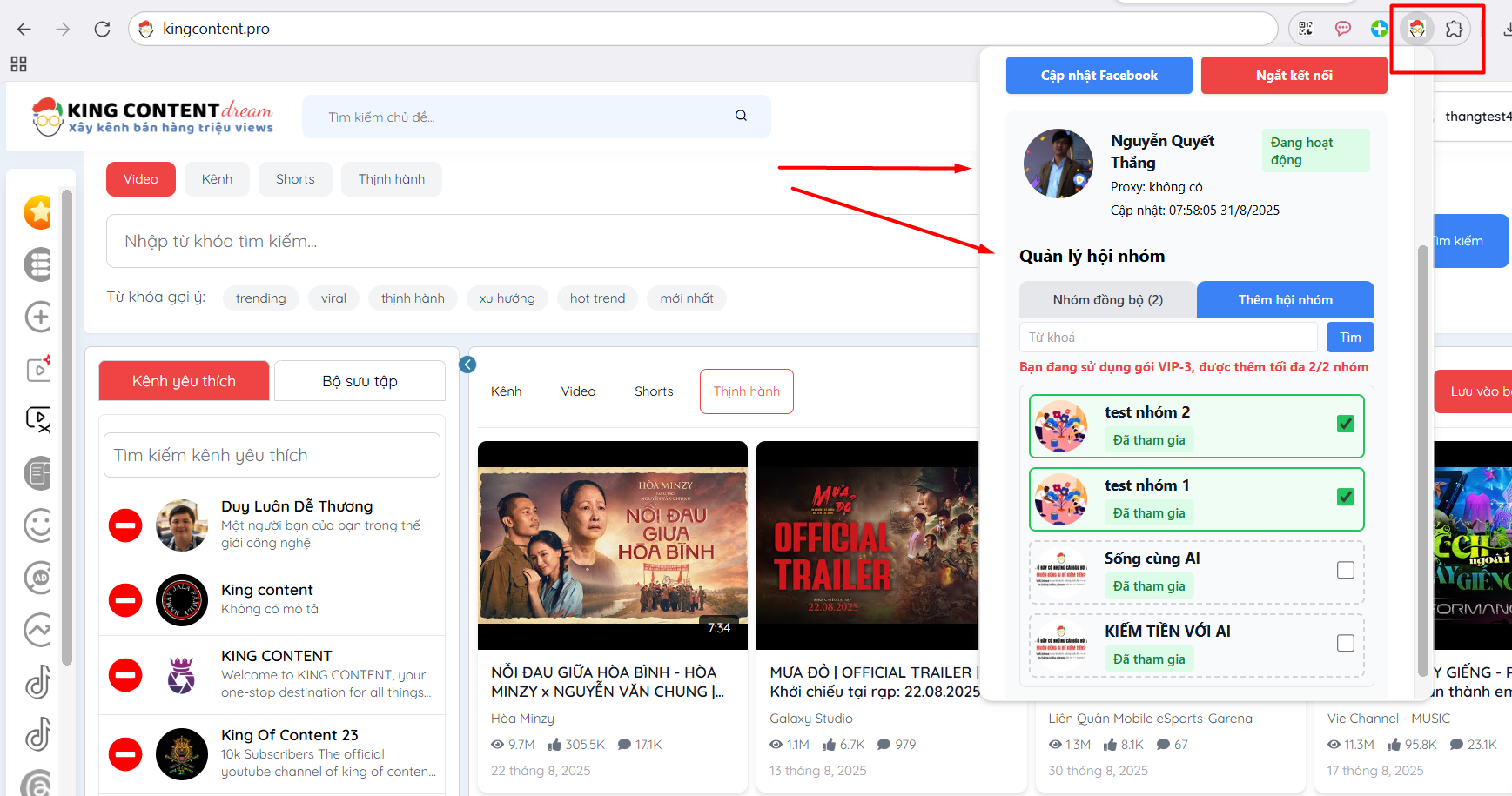 Bây giờ bạn quay lại Kingcontent sẽ thấy danh sách Facebook cá nhân và hội nhóm hiển thị: