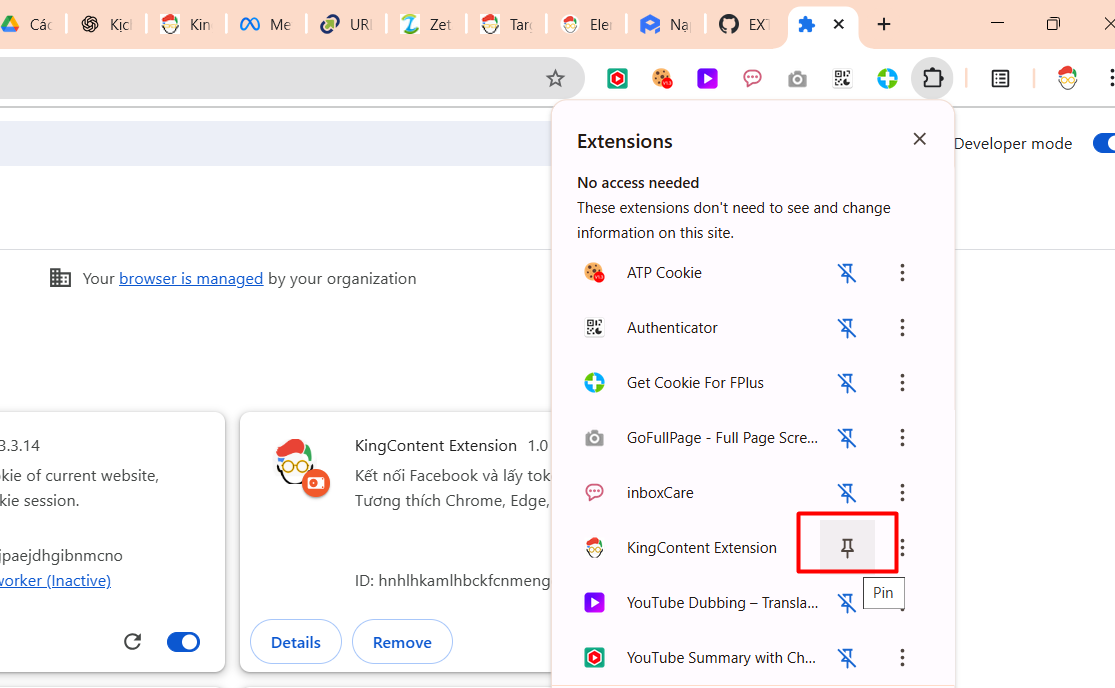 Bật chế độ NHÀ PHÁT TRIỂN rồi chọn cả Folder Kingcontent Extension