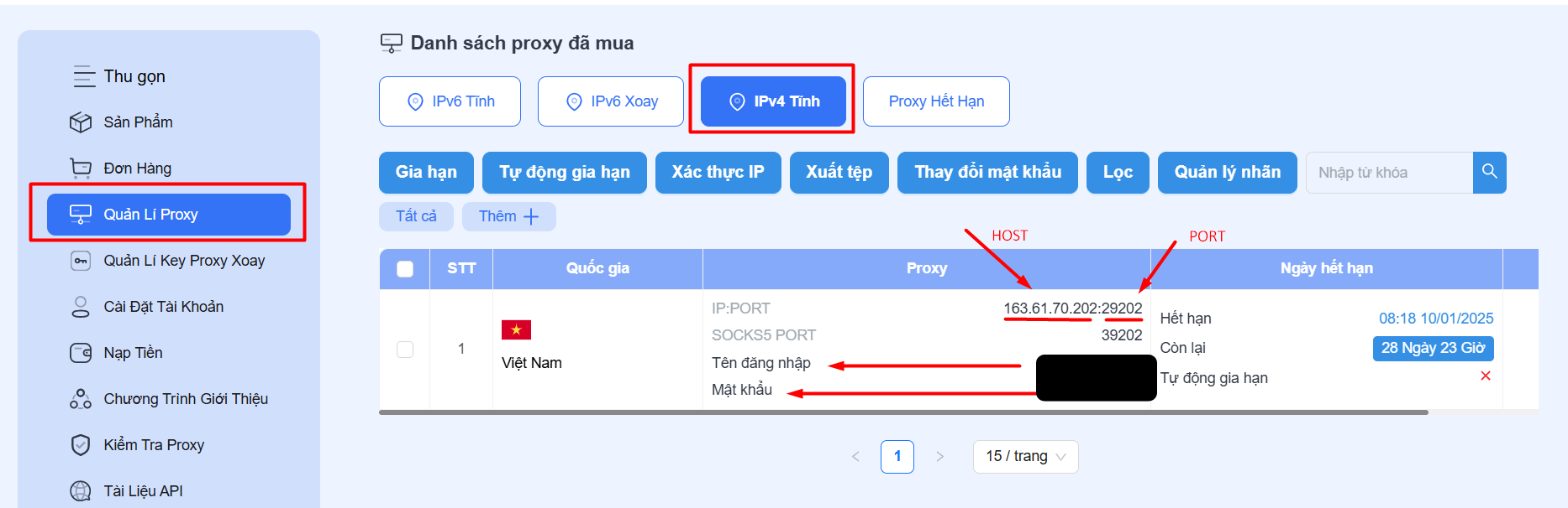 Sau khi mua thành công Proxy, lấy ra 4 thông số này: Host – Port – Tên đăng nhập – Mật khẩu. Ví dụ hình dưới, Host là dòng 163.61.70.202 , còn Port là dòng 29202 (phía sau dấu hai chấm)