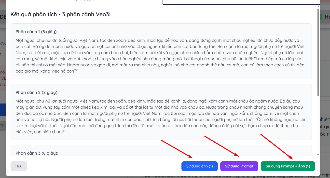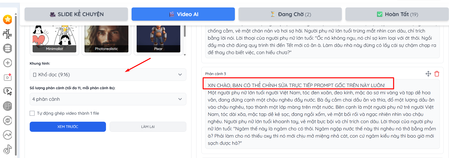 Tool nó tự đọc video gốc và đưa sẵn ý tưởng prompt cho sếp luôn nhé. Bây giờ có 3 lựa chọn thoải mái: