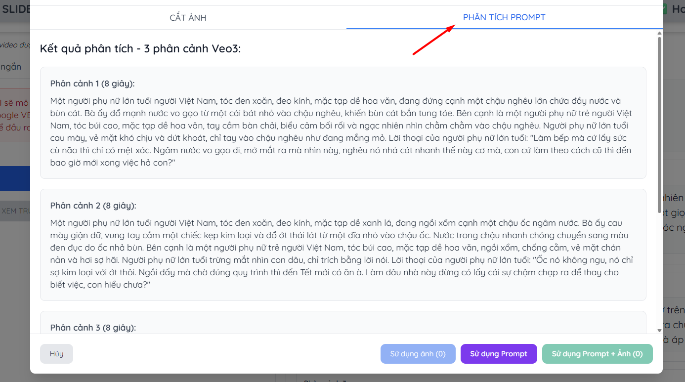 Chọn ra hình nhân vật nào bạn thích nhất để tạo video, hình này sẽ giữ nhân vật đồng nhất xuyên suốt video mới. Bây giờ mô tả hành động, lời nói, biểu cảm nhân vật ra sao? Dễ lắm, chỉ cần bấm vào tab PHÂN TÍCH PROMPT trên này: