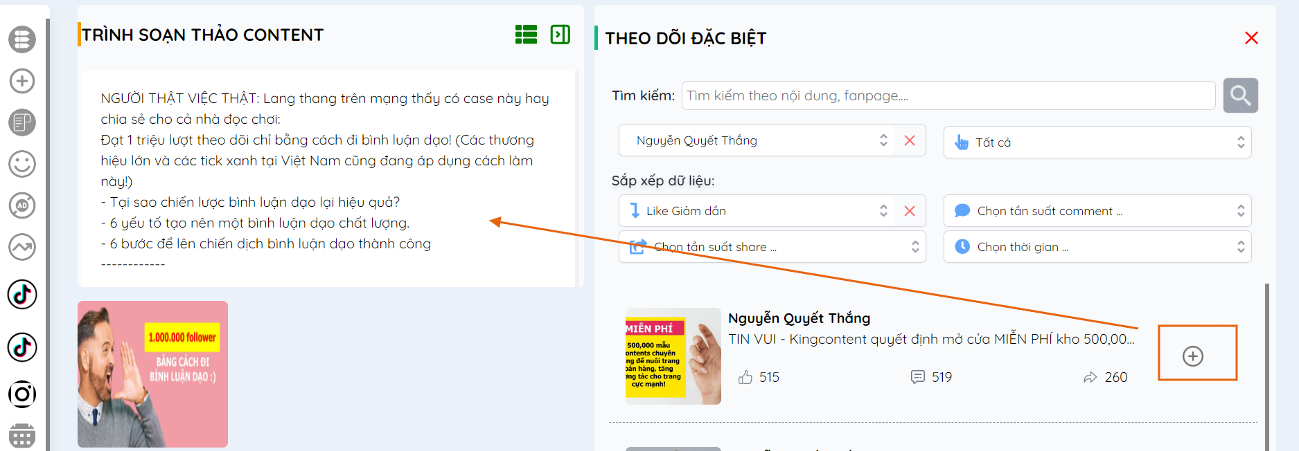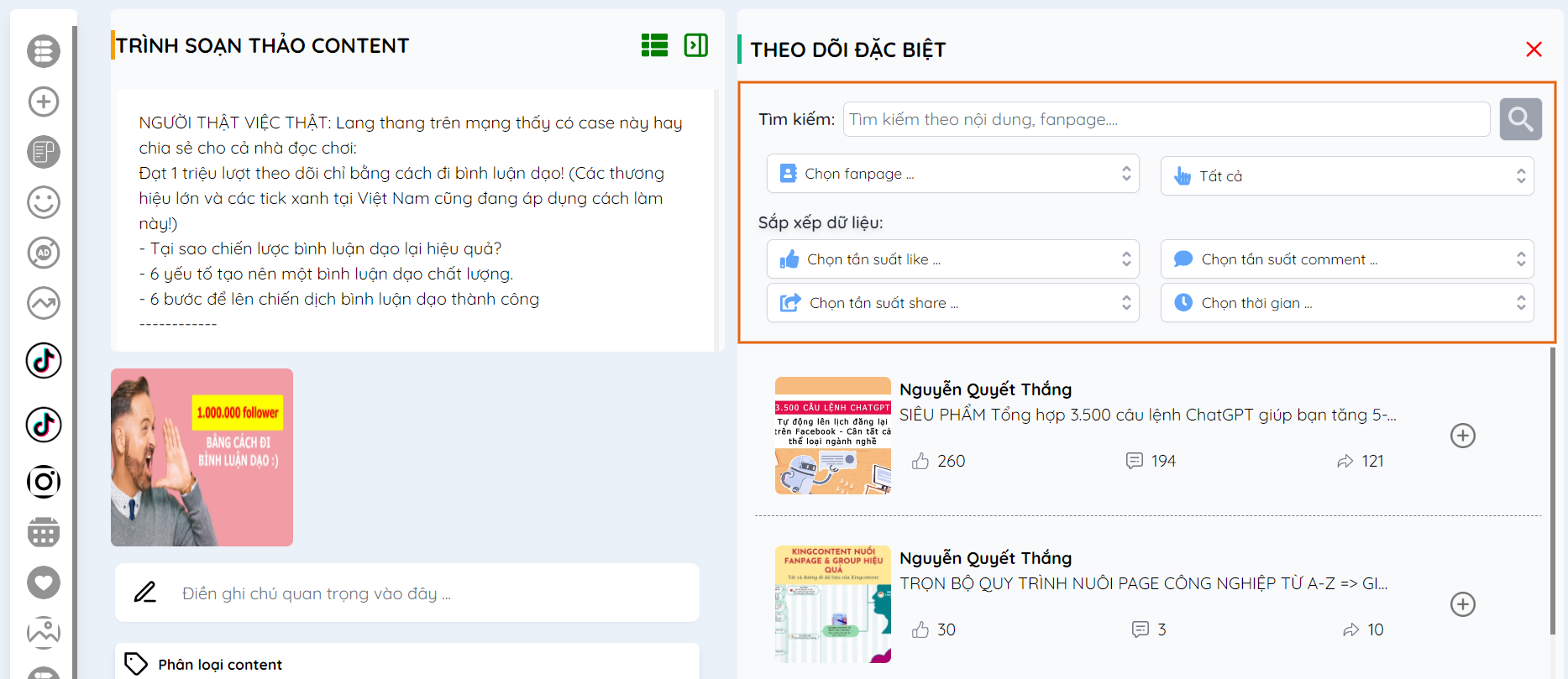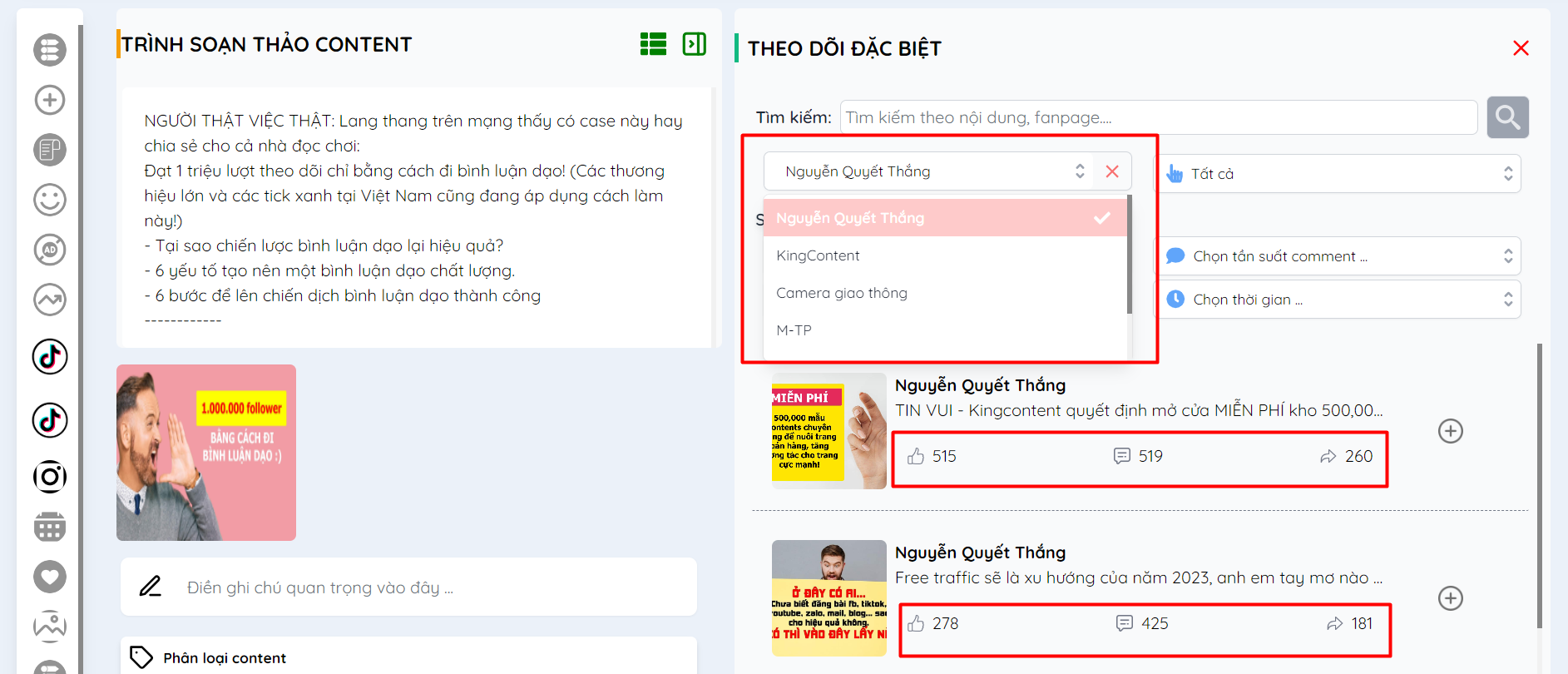Tại Kingcontent.pro, vào menu TẠO CONTENT MỚI, lập kế hoạch rồi bấm menu THEO DÕI ĐẶC BIỆT