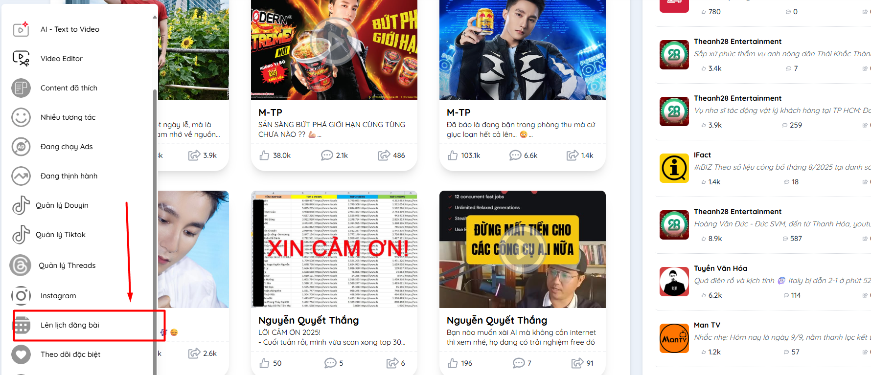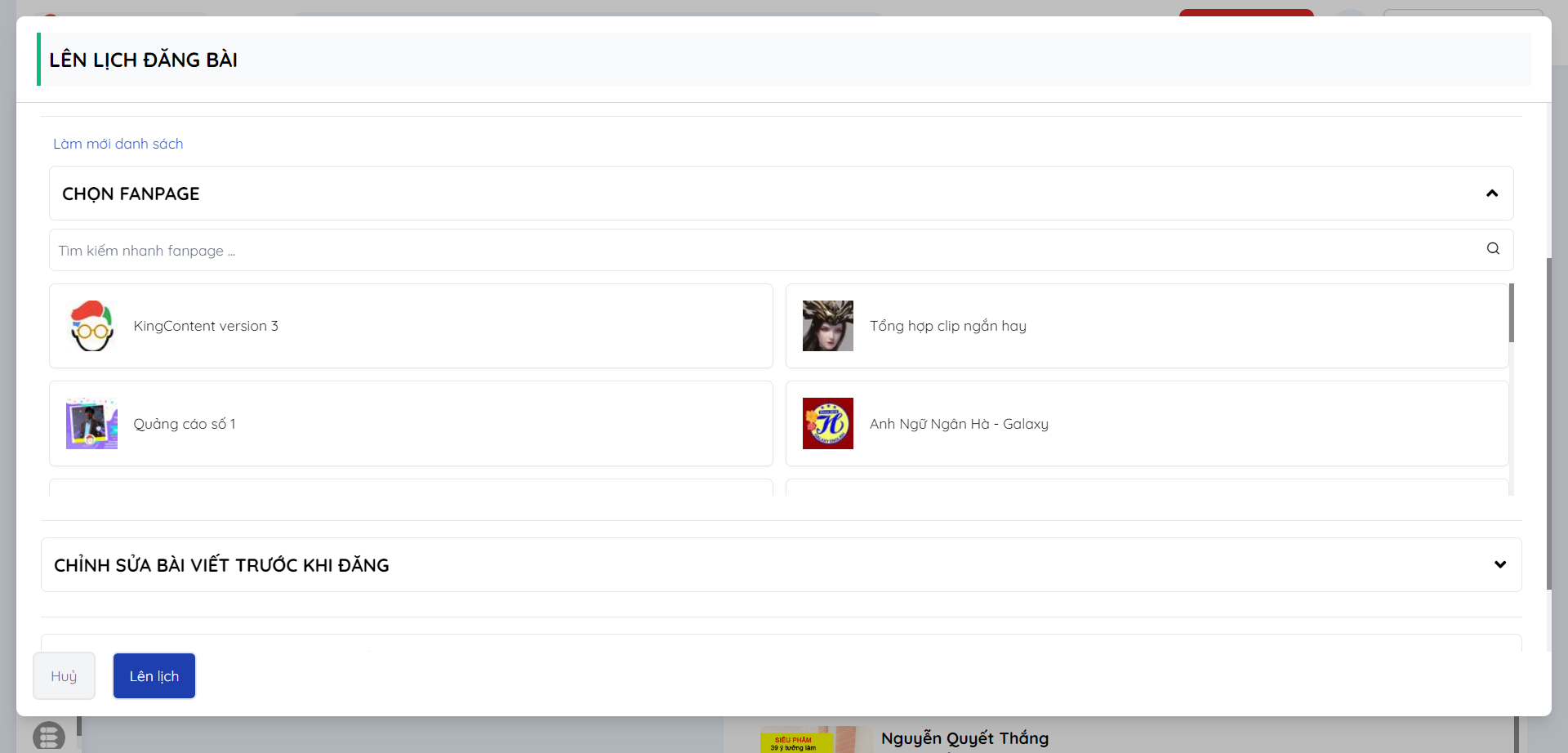 Sau khi có hàng loạt content muốn đăng thì chỉ cần lên lịch tự động đăng lại lên Facebook cá nhân, Group hay Fanpage của bạn. Vào menu LÊN LỊCH ĐĂNG BÀI