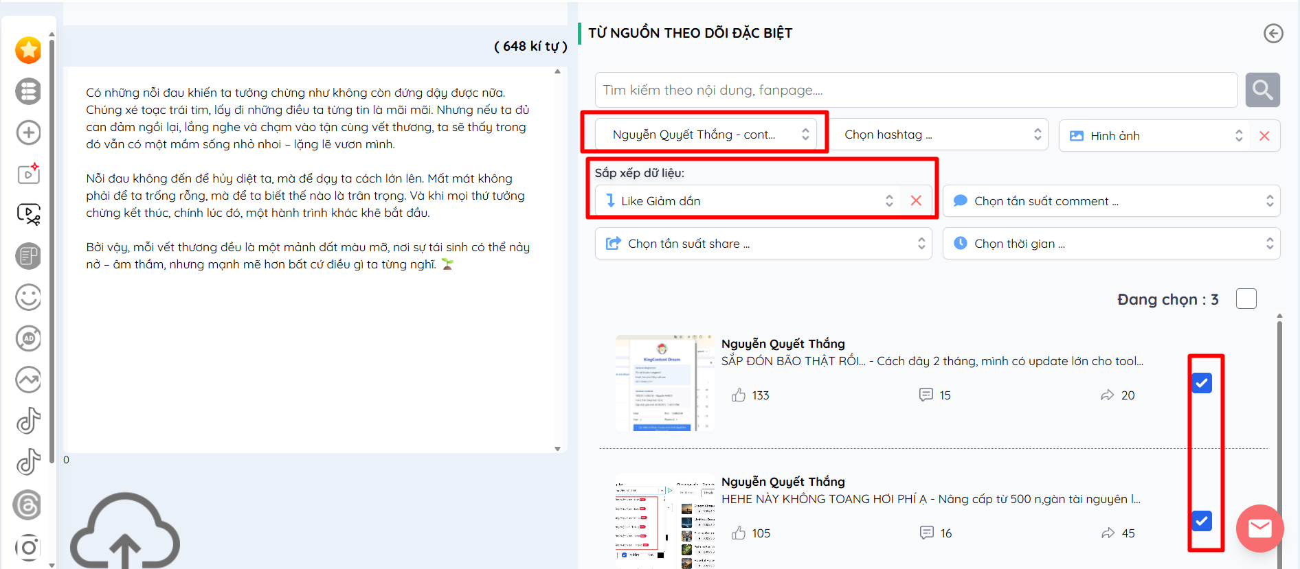Chỉ cần vào chức năng TẠO HÀNG LOẠT, chọn ra trang gốc (Fanpage, Group, Profile của bạn hoặc ai đó). Lọc tìm các bài viết có nhiều tương tác: